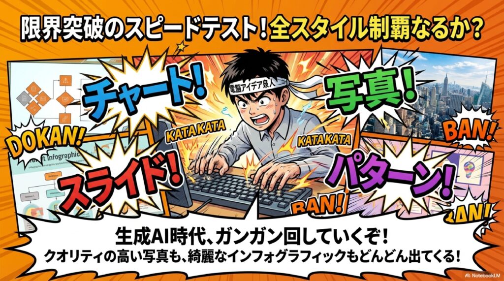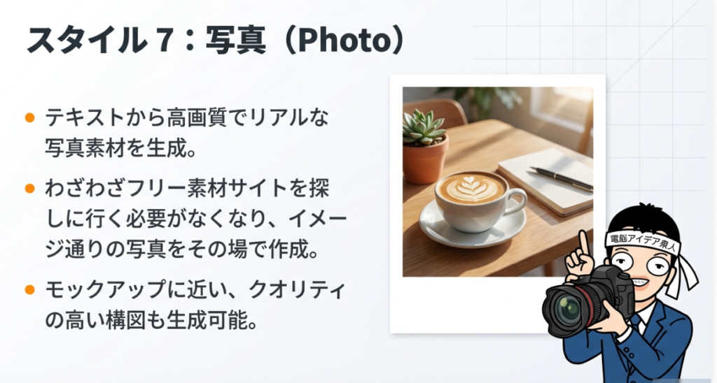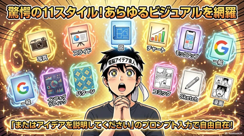 A3. 現時点で確認できているスタイルは、「一般」「図」「スライド」「チャート」「インフォグラフィック」「モックアップ」「写真」「パターン」「コミック」「Sketch」「漫画」の11種類以上です。それぞれ見た目の印象が大きく異なりますので、目的に応じて使い分けることがポイントです。コミックは吹き出し付き、漫画はアニメ調、Sketchは手書き風など、特徴がはっきり分かれています。