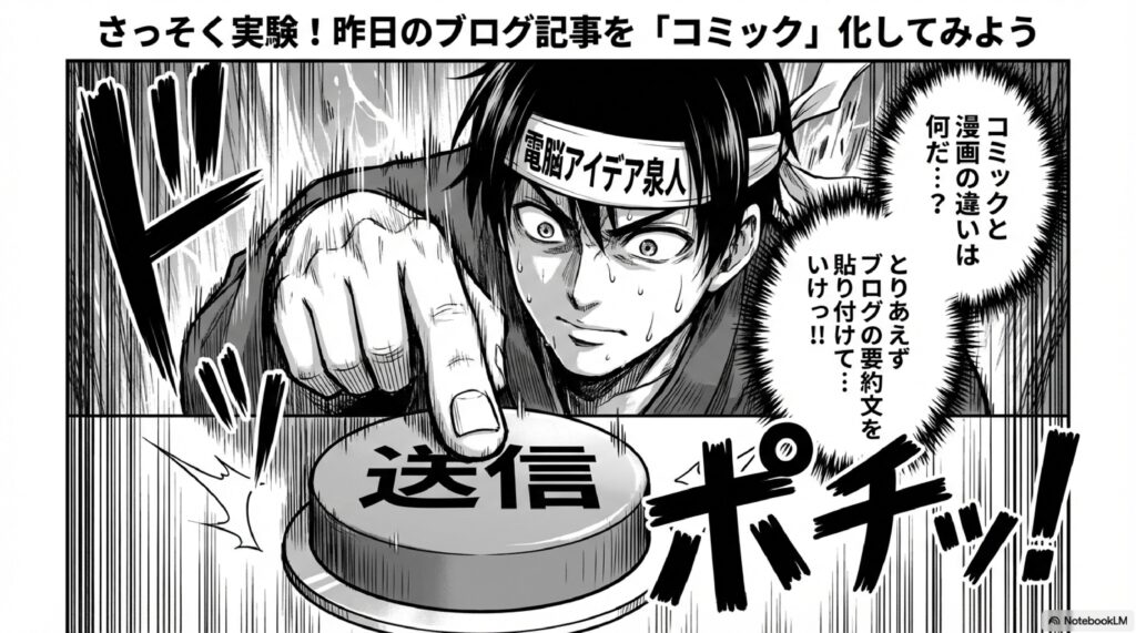 先ほどの文章をコピーして、AI画像にチェックをつけて、コミックにチェックをつけて送信ボタンを押してみます。今回はうまくいきました!コミックスタイルにすると、吹き出し付きのものが出てきます。しかも日本語のフォントも完璧にできているのがすごいですね。ちゃんとした仕上がりで、こんな感じでコミックスタイルの画像が生成できました。