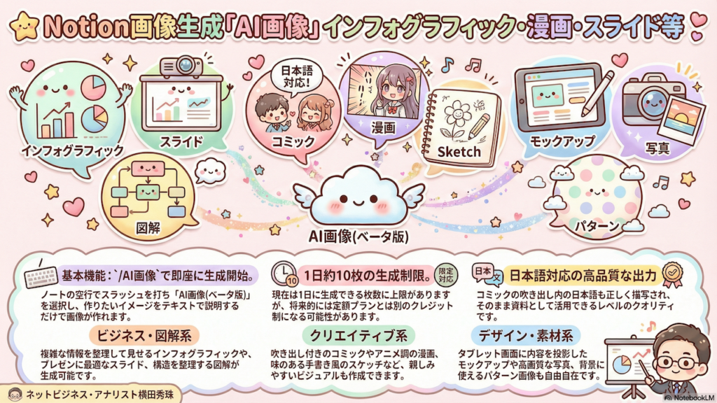 Notion画像生成「AI画像」インフォグラフィック・漫画・スライド等