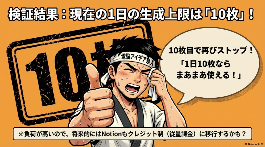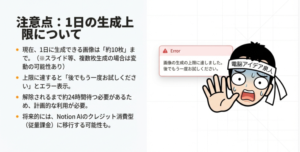 🔢 生成枚数の上限 NotionのAI画像機能には1日あたりの画像生成回数に制限が設けられている。検証では約10枚程度で上限に達し、それ以降は24時間ほど待つ必要がある。サービス開始直後はサーバー負荷によりさらに早く制限がかかる場合もあり、サーバーの混雑状況により変動する可能性がある。