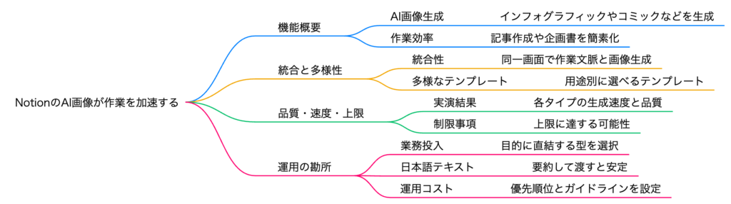 最後に、スタイルの使い分け戦略も重要です。社外向けの正式な資料にはインフォグラフィックやチャートを、社内のカジュアルな共有にはコミックや漫画を、企画段階のアイデア整理にはSketchスタイルを選ぶなど、シーンに応じたスタイル選択が効果を最大化します。Notion AI画像は生成上限がある分、1枚1枚の画像を戦略的に使うことで、少ない枚数でも業務の質を大きく向上させることができるのです。