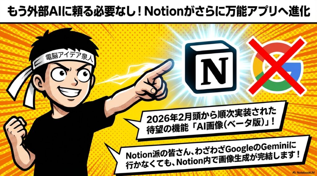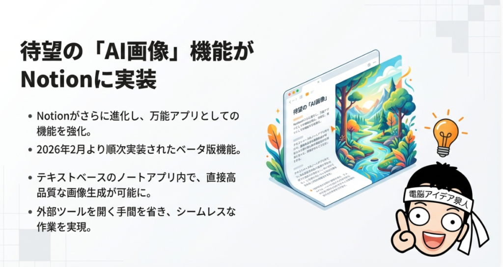 Notionはこれまで、テキスト生成・要約・翻訳といった言語処理を中心にAI機能を強化してきました。しかし2026年2月頃から、待望のAI画像生成機能がベータ版として順次ロールアウトされ、Notionユーザーの間で大きな話題となっています。この機能は、Notionのページ内から直接AIによる画像を生成できるもので、わざわざ外部の画像生成ツールに切り替える必要がなくなりました。