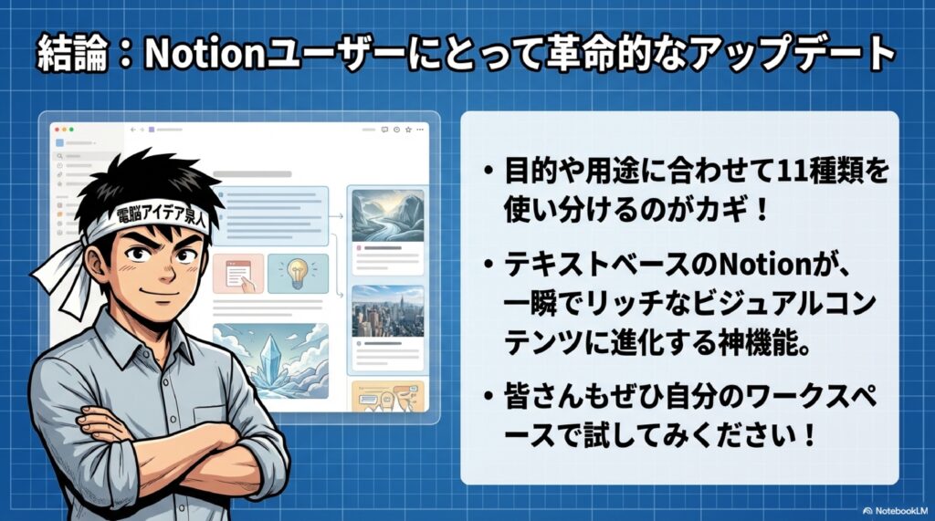 例えば、手順を説明したい時はコミックやスライド、概念を図解したい時は図やチャート、ちょっとおしゃれに見せたい時はモックアップや写真、アイキャッチに使いたい時はインフォグラフィックや漫画など、用途に応じた使い分けをすることで、NotionのAI画像機能の真価を発揮できるでしょう。