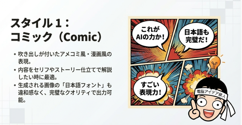 まず最初に試したのが「コミック」スタイルです。コミックと漫画の違いがちょっと気になるところですが、コミックの方は吹き出しがついているのが特徴です。吹き出し付きで内容を説明してくれるスタイルになっています。