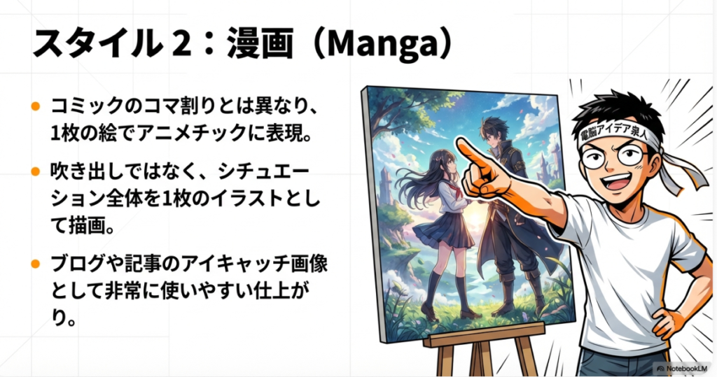 コミックスタイルは、吹き出し付きのコマ割り画像を生成するのが特徴です。ページの内容を登場人物のセリフとして表現し、ストーリー仕立てで情報を伝えてくれます。社内ニュースレターやチュートリアル資料など、堅い内容を親しみやすく伝えたい場面で威力を発揮します。漫画スタイルはコミックとは異なり、アニメチックなテイストの1枚絵として出力されます。吹き出しではなく、イラスト全体で情報を表現するため、ビジュアルインパクトが強く、ブログのアイキャッチ画像やSNS投稿に向いています。