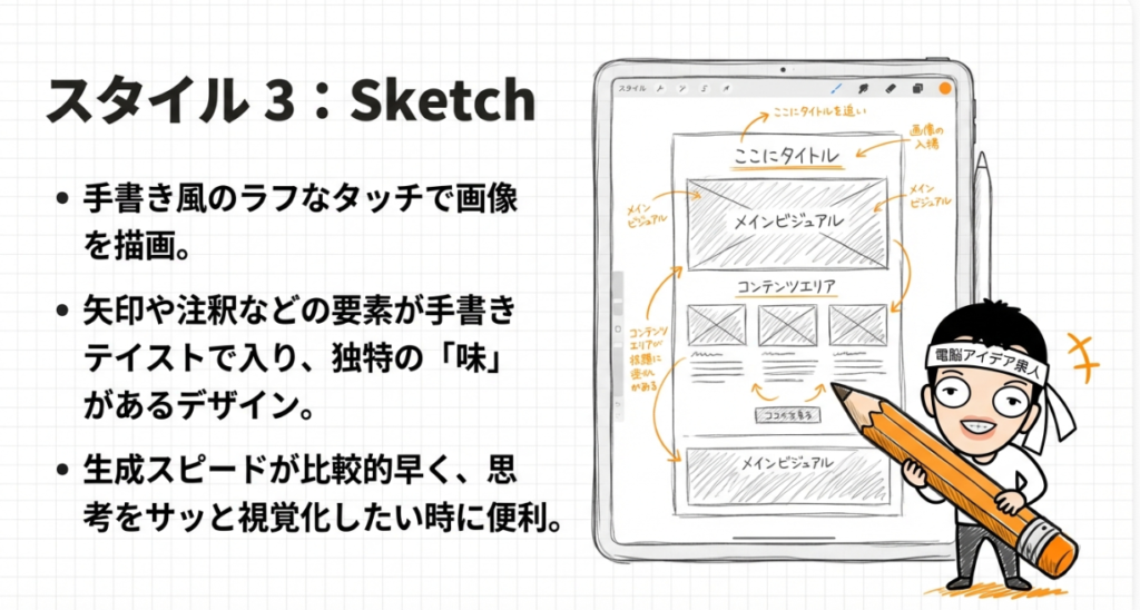 そして出てきた結果を見ると、手書き風の仕上がりになりました。これはこれで味があっていいですね。手書きで矢印が入っている感じなんかも非常に良い仕上がりです。なかなかこんなもの、自分では書けないですよね。Sketchスタイルもかなり使えるスタイルです。