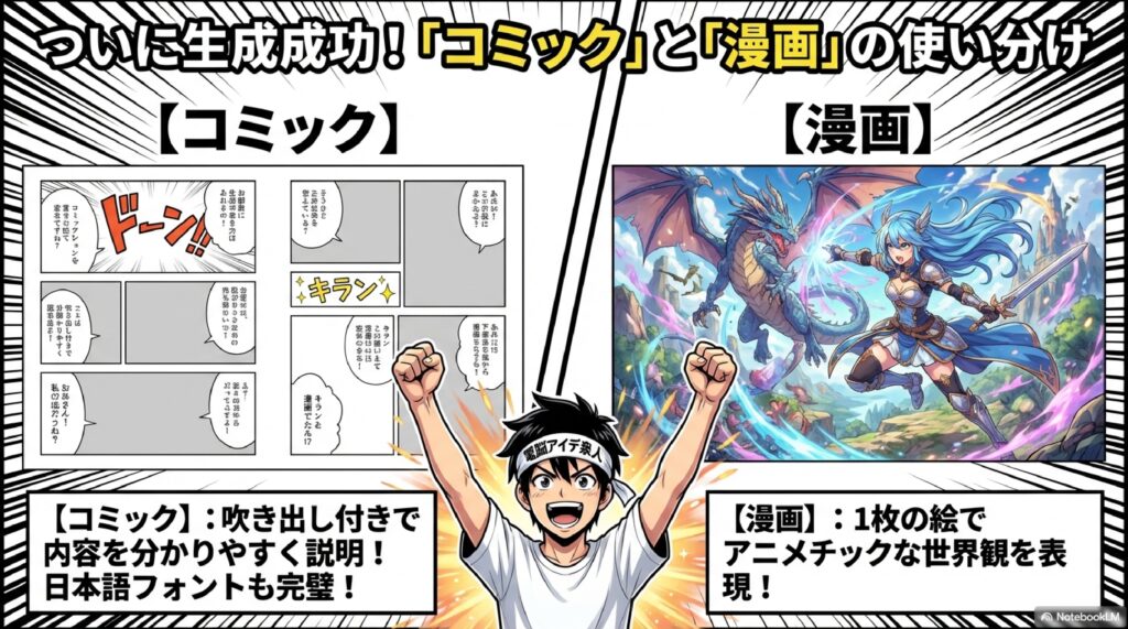 🎨 漫画 コミックとは異なり、アニメ調のイラストで1枚の画像としてまとめる形式のこと。吹き出しによる会話形式ではなく、絵の中にテキストを組み込んで視覚的に説明する。NotionのAI画像ではコミックと漫画が別カテゴリとして用意されており、表現したい雰囲気に応じて使い分けることができる。