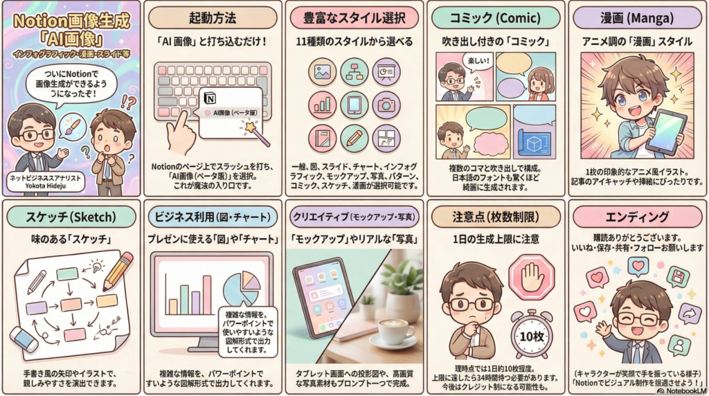 今回は、2026年2月頃から順次実装が始まったNotionのAI画像生成機能について、全12種類のスタイル(一般・図・スライド・チャート・インフォグラフィック・モックアップ・写真・パターン・コミック・Sketch・漫画・その他)を実際にすべて試しながら徹底レビューしました。