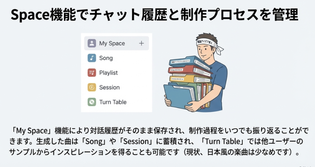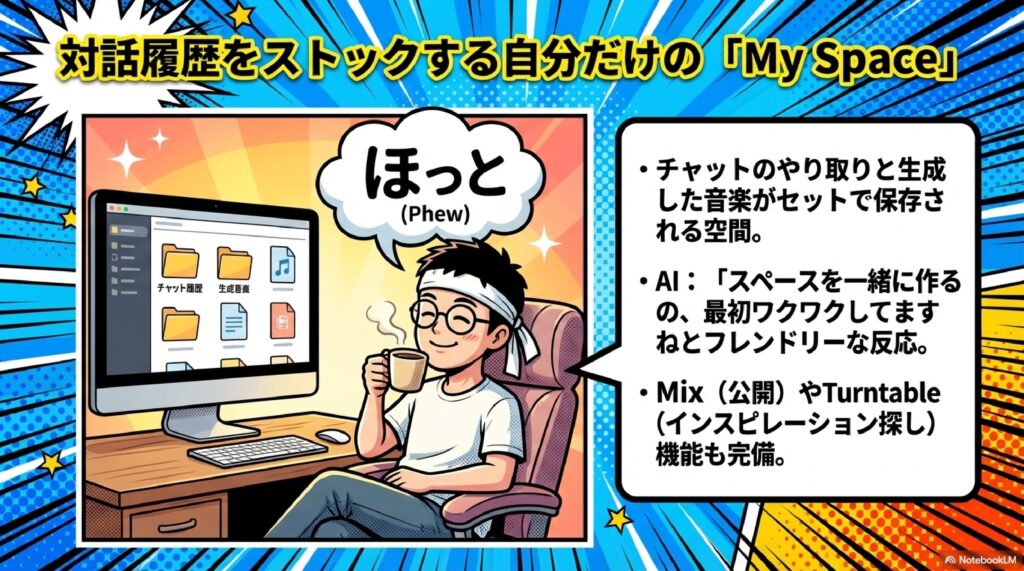 A5. 今回の体験では、日本語でのプロンプト入力に対応しており、日本語の歌詞も生成されました。ただし、インターフェースの一部はまだ英語表記のままであったり、説明文が英語で表示される場面もありました。また、ターンテーブル機能に日本風のサンプルが少ないなど、日本語・日本文化への最適化はまだ発展途上という印象です。今後Googleの傘下で多言語対応が強化されることに期待したいところです。