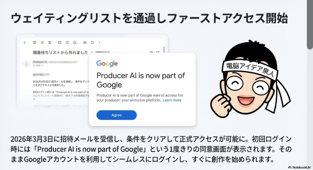 A3. Googleが ProducerAIを買収したのは2026年2月25日です。この日に買収が発表され、Google Labsの新サービスとして統合されることが明らかになりました。その後、2026年3月3日頃からウェイティングリストに登録していたユーザーに対してファーストアクセスの招待メールが届き始めています。