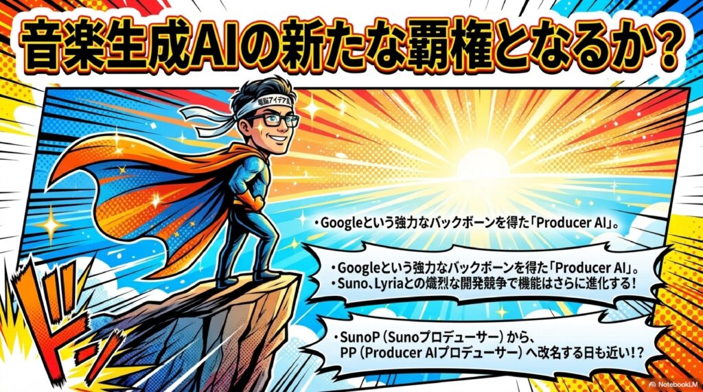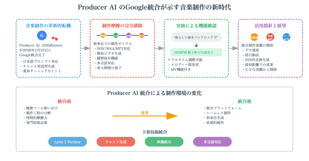 🏢 Google買収 2026年2月25日、GoogleがProducerAIを買収しGoogle Labsの新サービスとして統合することを発表。Googleの既存の音楽AI技術「Lyria」との相乗効果が見込まれ、音楽生成AI市場におけるGoogleの本格参入を象徴する動きとして大きな話題となった。