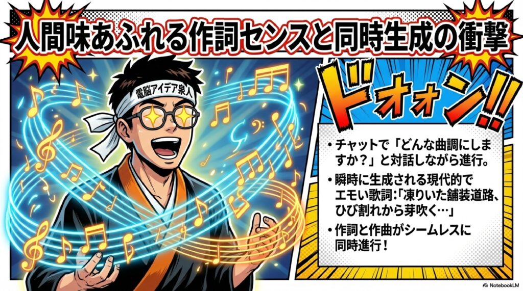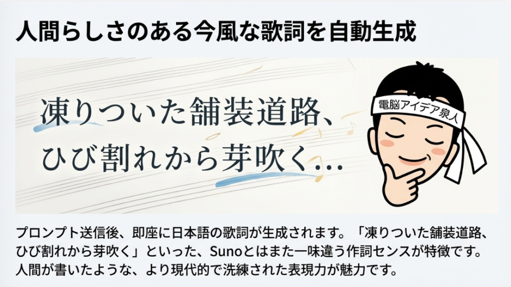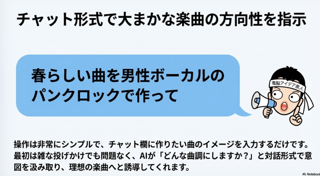 💬 チャット形式生成 テキストで指示を入力するだけでAIが作詞・作曲を同時に行う仕組み。「春らしい曲を男性ボーカルのパンクロックで作って」のように自然言語で依頼でき、さらに「切ないメロディーにして」と追加指示することで曲調の修正も対話的に行える。