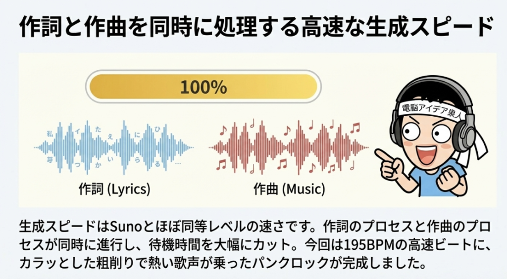 ⏱️ 生成スピード ProducerAIの楽曲生成にかかる時間はSunoとほぼ同等で、チャットで指示を送ってから数十秒〜1分程度で完成する。進捗がパーセンテージで表示され、作詞と作曲が同時並行で処理される効率的な仕組みにより、テンポよく音楽制作を進められる。
