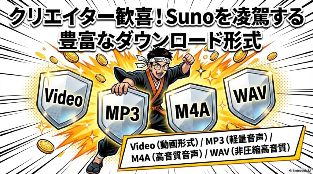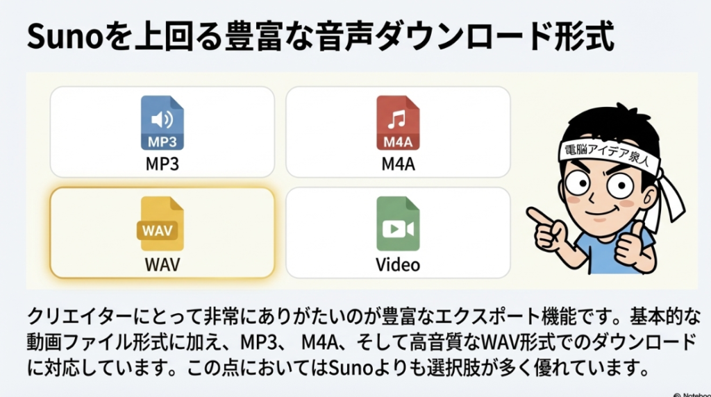 📥 ダウンロード形式 ProducerAIでは生成した楽曲をMP3、M4A、WAV、さらにビデオ形式でダウンロードできる。競合サービスのSunoよりも対応フォーマットが多く、用途に合わせた柔軟な書き出しが可能。音質重視のWAVから軽量なMP3まで選べる点が利便性を高めている。