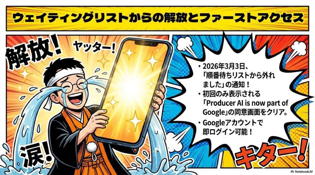ProducerAIを利用するには、まず公式サイト(producer.ai)にアクセスしてアカウントを作成する必要があります。現在はGoogle Labsの一部として運営されているため、Googleアカウントでのログインが最もスムーズな方法です。2026年3月現在、ウェイティングリストによるアクセス制限が段階的に解除されており、条件をクリアしたユーザーには「順番待ちリストから外れました」という通知メールが届く仕組みになっています。