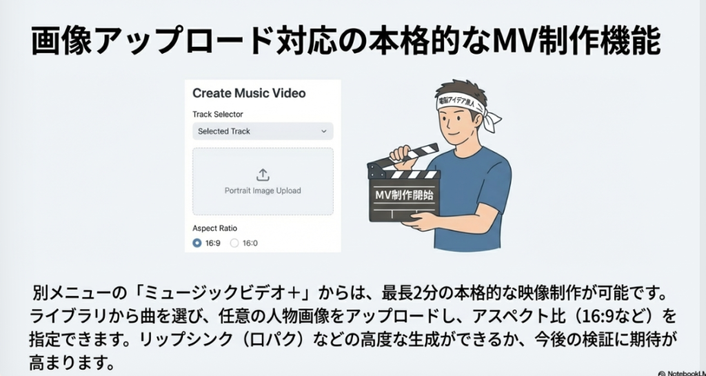 🎬 ミュージックビデオ生成 ProducerAIが提供する機能の一つで、作成した楽曲に合わせた映像を自動生成できる。最長2分の動画を作成可能で、アスペクト比の選択や人物画像のアップロードにも対応。Sunoの歌詞表示型動画より一段階進んだ映像表現が可能となっている。