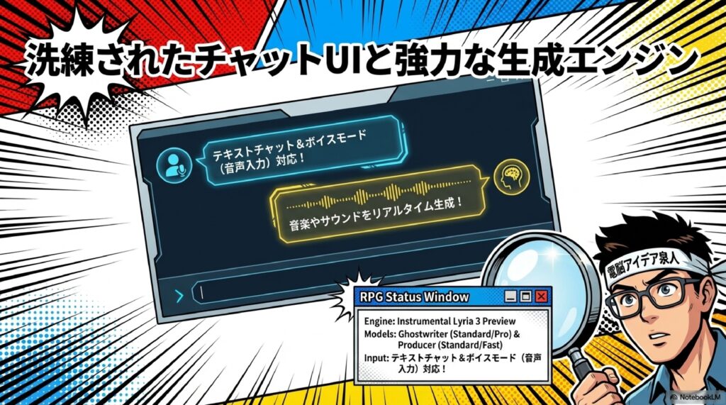 Google統合後のProducerAIは、技術スタックが大きく刷新されました。音楽生成の中核エンジンにはGoogle DeepMindが開発した最新モデル「Lyria 3」のプレビュー版が搭載されています。Lyria 3はリズムやアレンジメントといった「音楽性」を深く理解し、テンポや歌詞のタイミングなど細かいパラメータの制御が可能なプロフェッショナルグレードの音楽生成モデルです。会話インターフェースにはGeminiが採用されており、ユーザーはチャット形式で自然言語による指示を行いながら楽曲を制作できます。