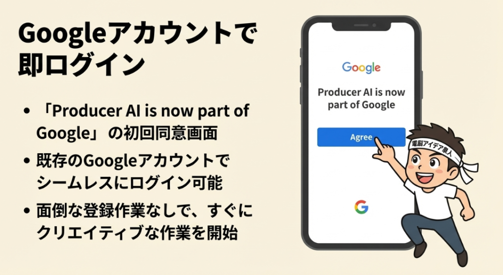 Producer AI is now part of Google」の同意画面が表示(初回のみ)