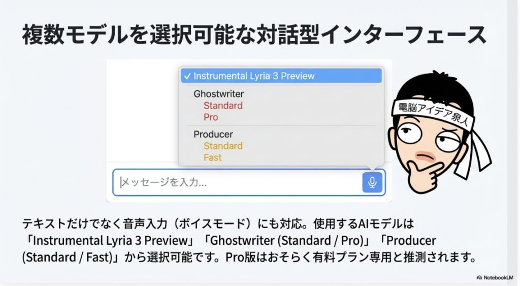 🎤 Instrumental Lyria 3 Preview ProducerAI内で使用されているGoogleの音楽生成モデル。Google買収後に統合されたと見られ、楽器演奏パートの生成を担う。Ghostwriter機能と組み合わせることで、ボーカル付きの完成度の高い楽曲をAIだけで制作可能にしている。