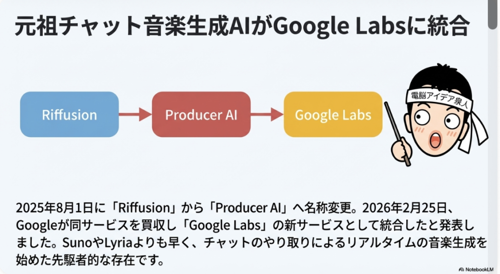 1:00 📰 Riffusion→ProducerAIへの名称変更とGoogle買収の経緯