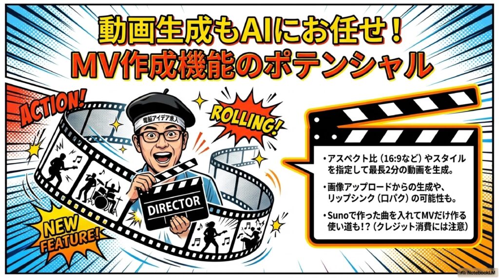 ProducerAIのGoogle統合後の目玉機能のひとつが、AIによるミュージックビデオ(MV)生成です。これにはGoogleの動画生成モデル「Veo」が使用されており、楽曲を選択してアスペクト比(16:9など)や動画の長さ(最長2分)を指定するだけで、AIが自動的に映像付きのMVを生成してくれます。Sunoにも歌詞表示型の簡易ビデオ機能はありますが、ProducerAIではチャットを通じて映像のディレクションも行えるため、より高度なMV制作が可能です。ただし、MV生成には3600クレジットが必要で、月額8ドルプランで得られる3000クレジットを上回るため、無料枠での利用には制限がある点に注意が必要です。