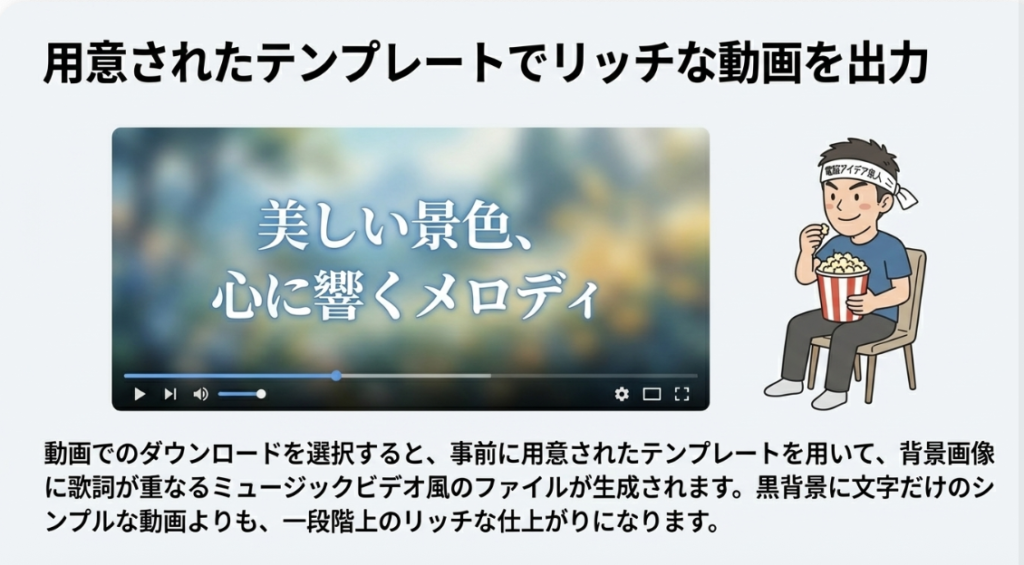 A4. はい、ダウンロード可能です。対応形式はビデオ形式、MP3、M4A、WAVの4種類で、Sunoよりもダウンロードの選択肢が多くなっています。また、ビデオダウンロードではテンプレートを選択して歌詞付きの映像を生成することもでき、さらにミュージックビデオ機能を使えばチャットのやり取りでより本格的な映像作品を作ることもできます。