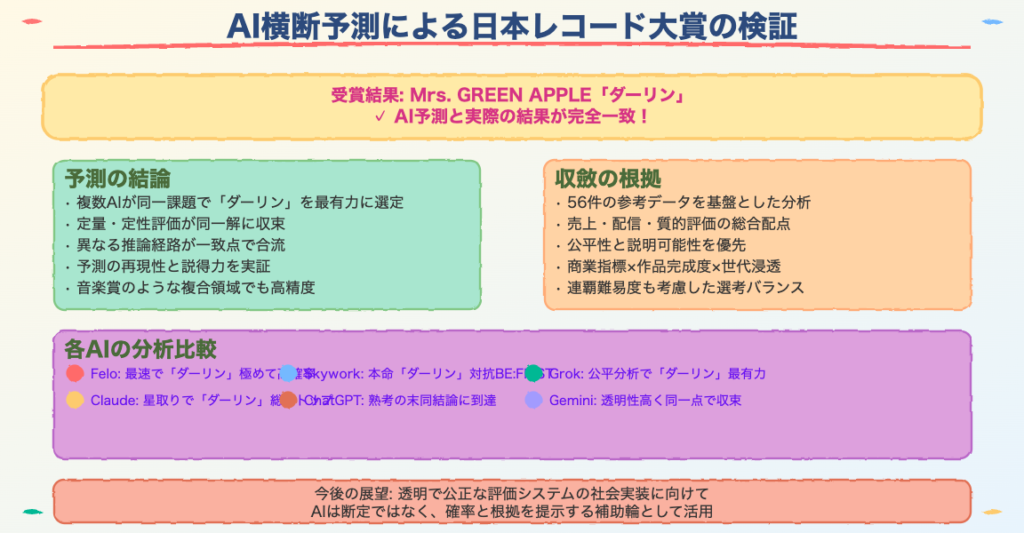 2025年12月30日、日本レコード大賞の受賞者を複数のAIで予測する検証が行われた。ChatGPT、Google Gemini、Claude、Felo、Genspark、Skywork、Grokの7つのAIのDeep Research機能を使用し、優秀作品賞ノミネート曲を多角的に分析。処理速度に差はあったものの、全てのAIがMrs. GREEN APPLEの「ダーリン」を最有力候補と予測した。対抗馬にはBE:FIRSTやアイナ・ジ・エンドが挙げられた。結果、第67回日本レコード大賞はAI予測通り「ダーリン」が受賞し、AIの分析精度の高さが証明された。