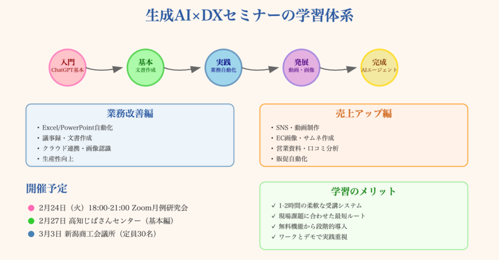 2026年のネットビジネス研究会セミナーは、従来の4段階から5段階(入門、基本、実践、発展、完成)に拡充。業務改善編と売上アップ編の2軸構成で、ChatGPTやNotebookLM、Gemini、Claude等の生成AIツールを段階的に学べる。基本編では文章作成やメール作成、実践編では画像・動画生成、発展編ではAIツール作成、完成編ではAIエージェントやクローン技術まで扱う。入門編は1時間、他は2時間構成で柔軟な組み合わせが可能となっている。