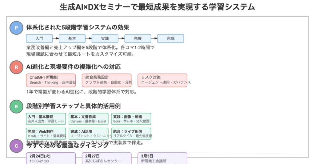 本記事では、2026年1月25日に配信されたネットビジネス研究会の最新情報をもとに、今年度の生成AI活用セミナーの全貌をご紹介します。入門から完成まで5段階に分かれた体系的なカリキュラムは、初めて生成AIに触れる方から、すでに実践している方まで、それぞれのレベルに合わせた学びを提供します。業務改善編と売上アップ編の2つの軸で構成された充実のプログラムを通じて、あなたのビジネスに革新をもたらすヒントが必ず見つかるはずです。