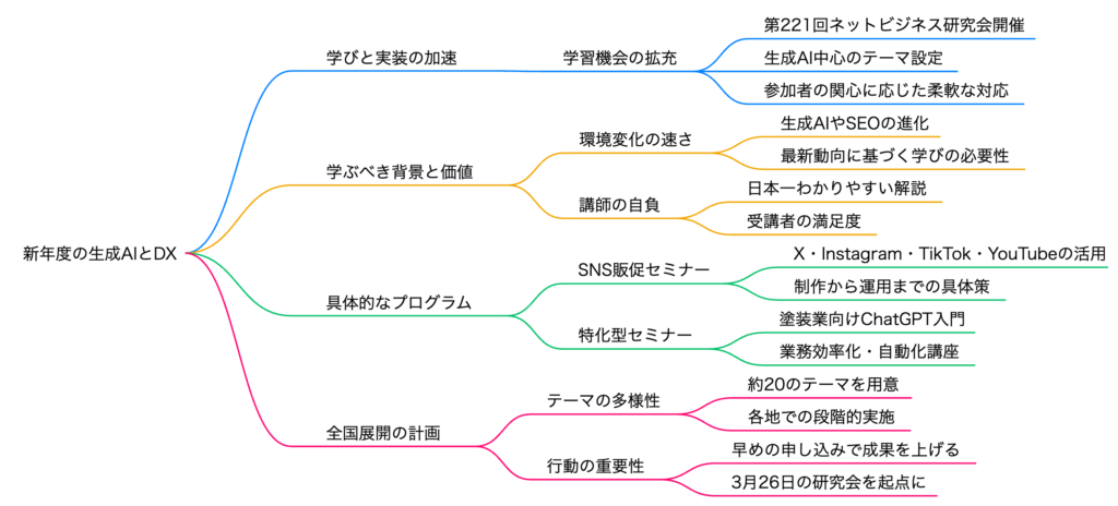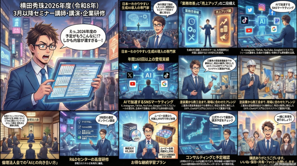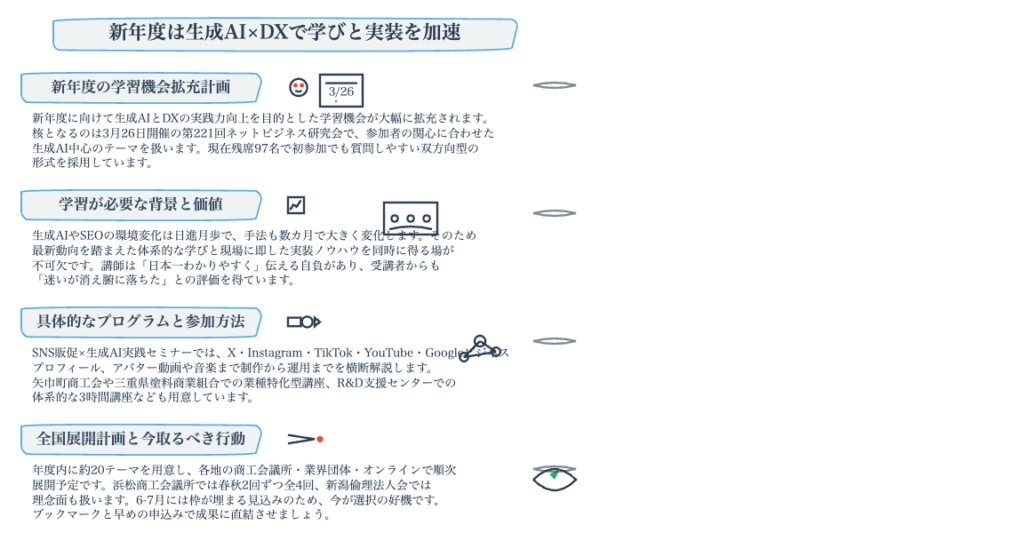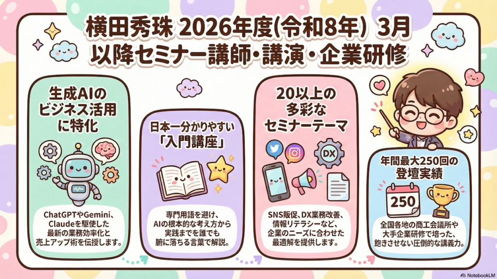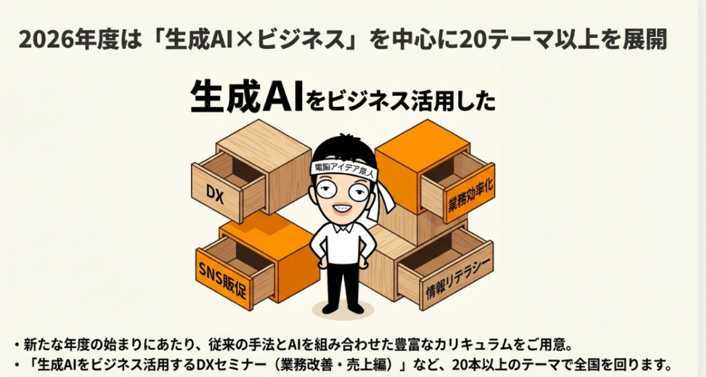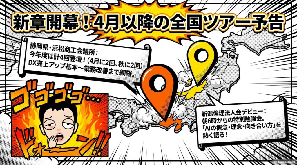 今回は、2026年3月以降に全国各地で開催予定のセミナー・講演情報を一挙にご紹介しました。ネットビジネス研究会の定例セミナーに加え、SNS販促セミナー、矢巾町商工会での続編、三重県の塗装業界向けの入門講座、浜松商工会議所での年間シリーズ、新潟倫理法人会での理念的なお話、そして東京のオンライン研修まで、非常に幅広いラインナップとなっています。生成AIの進化は止まりませんが、大切なのは最新ツールを追いかけることではなく、ビジネスの根本にある「なぜAIを使うのか」という考え方をしっかり理解することです。入門編から実践編まで、レベルに合わせたセミナーを用意していますので、ぜひブログのセミナー予定ページをブックマークして、ご自身の地域で開催されるものをチェックしてみてください。皆さんのご参加を心よりお待ちしています。