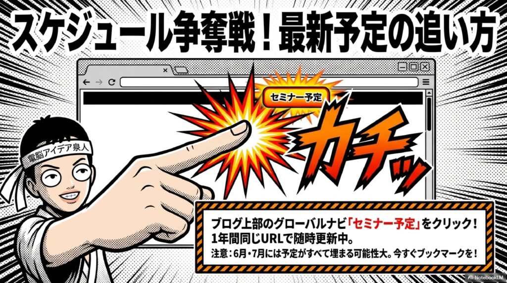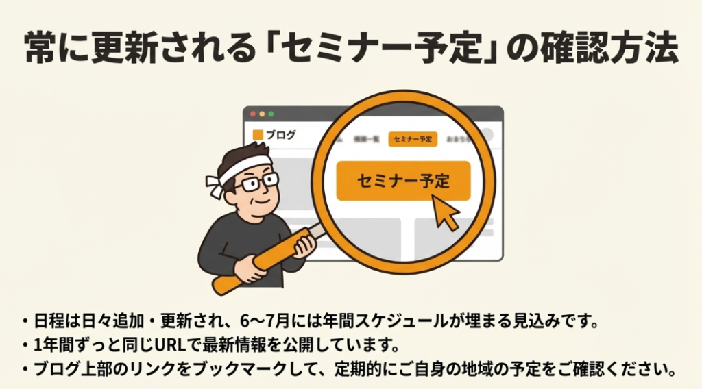 A4. ブログのグローバルナビにある「セミナー予定」のページをご確認ください。年間を通じて同じページに予定を追加していく形になっていますので、一度ブックマークしておけば、いつでも最新の予定をチェックできます。早ければ6〜7月頃にはスケジュールがかなり埋まってきますので、こまめにチェックすることをおすすめします。詳細のリンクが貼られていない場合でも、お問い合わせいただければご案内いたします。