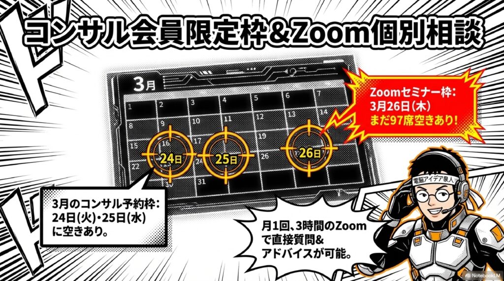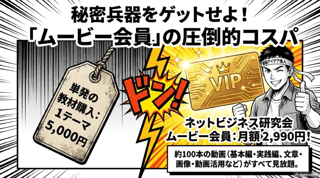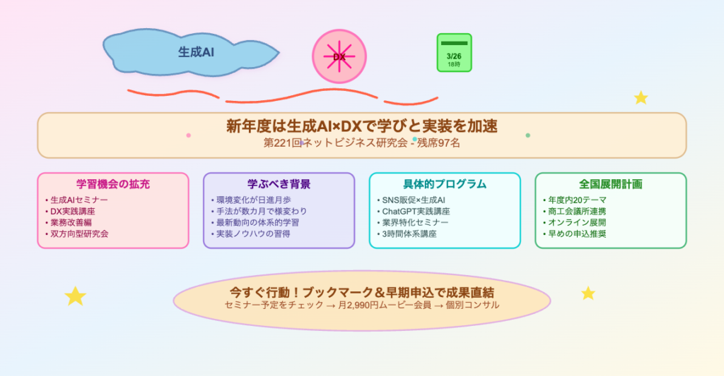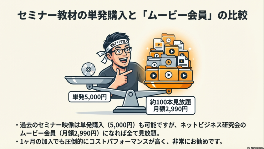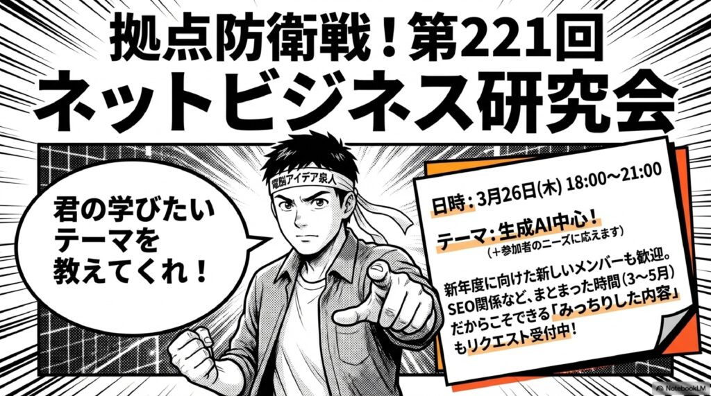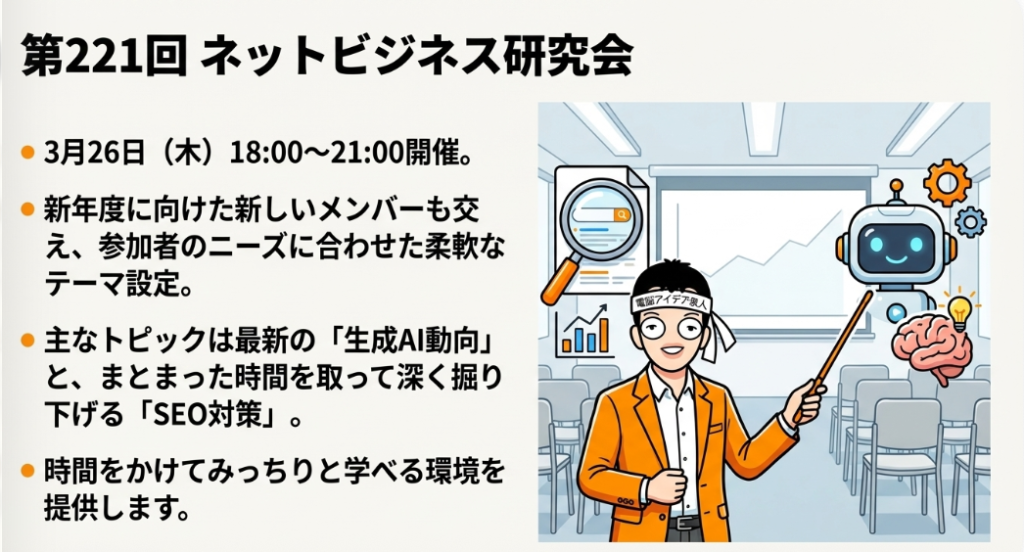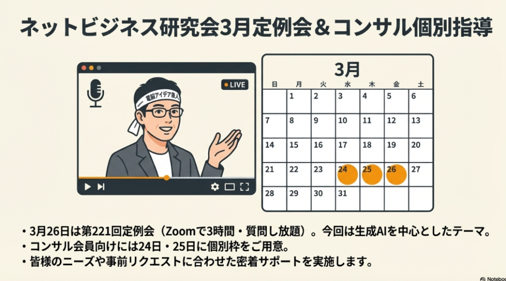 🗓️ ネットビジネス研究会 弊社が主催する定期的な勉強会・セミナーの総称。第221回(3月26日開催)のように毎月行われ、生成AIを中心にテーマを設定。セミナー会員やコンサル会員、ムービー会員などの会員区分があり、Zoomによる3時間のセミナー受講や月額2,990円で100本以上の動画見放題といった特典が用意されている。
