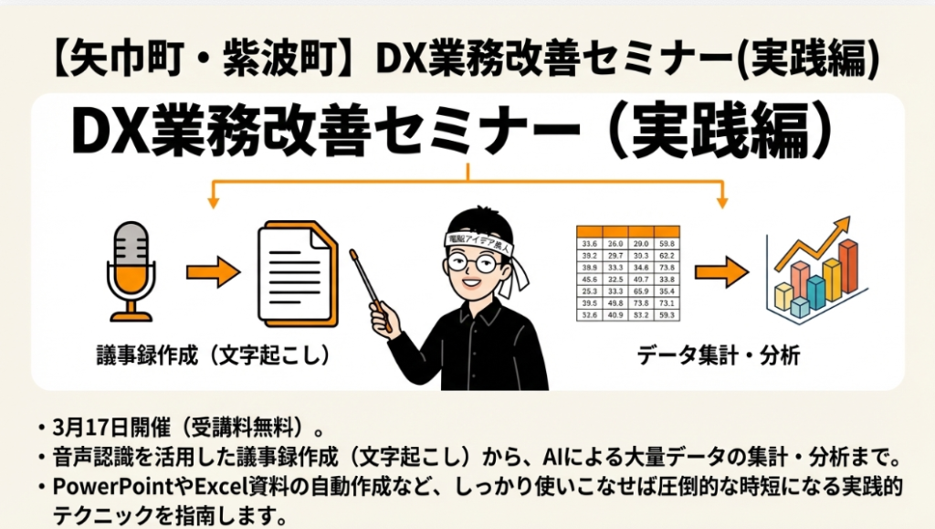 📈 DXセミナー デジタルトランスフォーメーション(DX)をテーマにしたセミナーのこと。「業務改善・売上編」と「IT活用編・生成AI活用編」の2つの切り口があり、従来のやり方と生成AIを使った新しいやり方を対比しながら、ビジネスにおけるデジタル化の推進方法を具体的に解説する内容となっている。