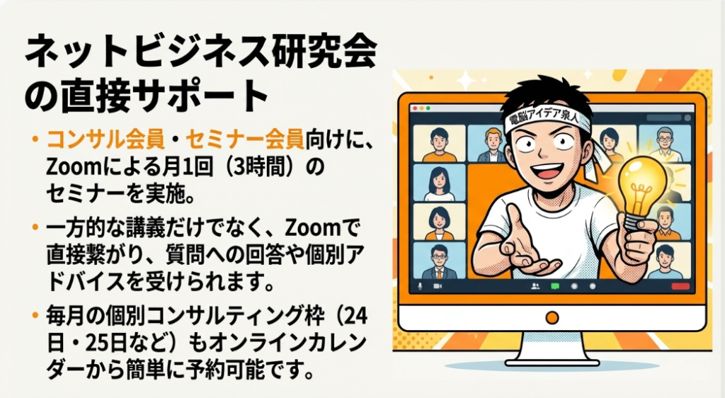 今度はネットビジネス研究会のセミナー会員もしくはコンサル会員の方は、月1回のZoomによるセミナーを3時間受けることができます。もちろん僕が説明するようなセミナーなんですが、Zoomで繋がっているわけなので、質問に答えてアドバイスをするということもできますので、何でもそこで聞いてもらえればお答えしたいと思っています。