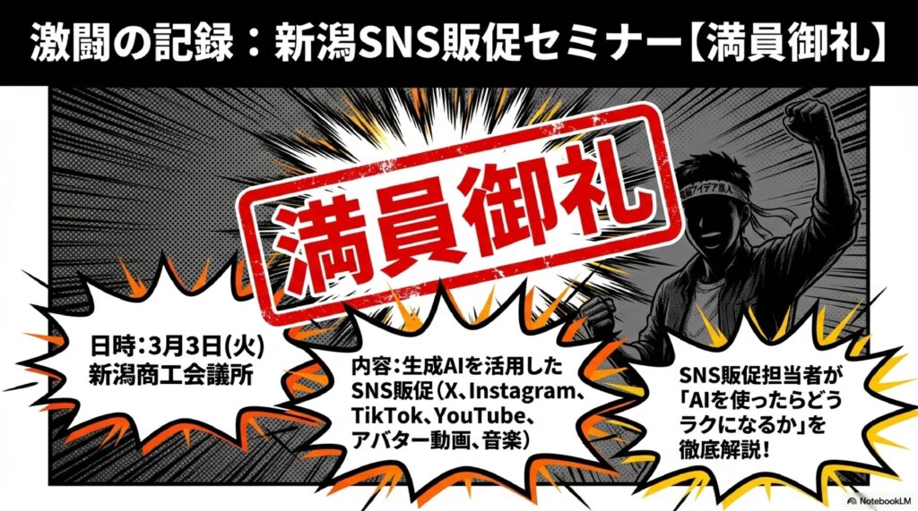生成AIのビジネス活用において、業務改善と並んで大きな効果が期待できるのがSNS販促やマーケティング領域への応用です。近年のセミナーでは、AIを活用したSNS運用やコンテンツマーケティングの実践的なテクニックが人気テーマとなっており、特に中小企業の売上向上に直結する活用法が数多く紹介されています。