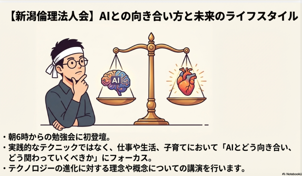 🌅 倫理法人会 朝6時から勉強会を行っている経営者向けの団体。講演者が新たにデビューする場で、実践的なAIテクニックではなく、AIとの向き合い方や仕事・生活・子育てにおけるAIとの関わり方など、概念的・理念的な内容を1時間で話す予定。新潟市での開催が予定されている。