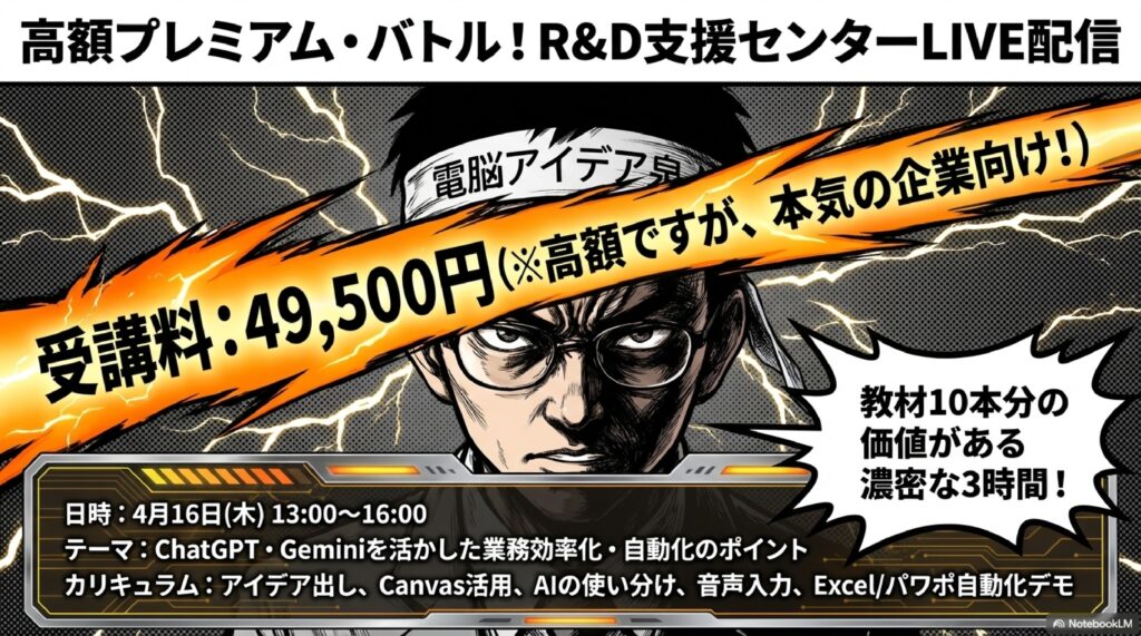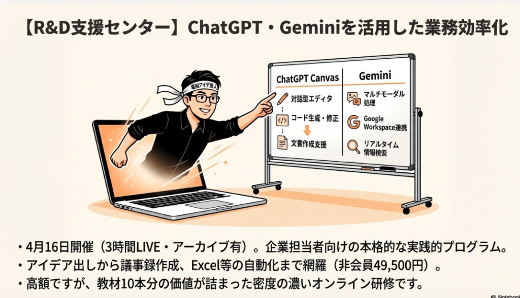 🎓 R&D支援センター オンライン研修を提供する企業で、講演者に講演依頼をした組織。「ChatGPT・Geminiを活用した業務効率化・自動化のポイント」をテーマに3時間のオンライン講座を開催予定。アイデア出し、メール・文書作成、議事録、資料自動化などを学べるが、受講料が高額である点が言及されている。