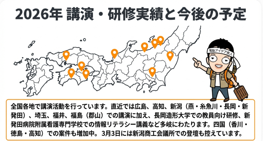 で、丸亀とあともう1個、香川県と徳島県もまた仕事は今年入りそうなので、結構四国だらけになりますね。そして高知ですね、あります。そしてこちら新発田病院附属看護専門学校さんの方で情報リテラシーの講演があります。
