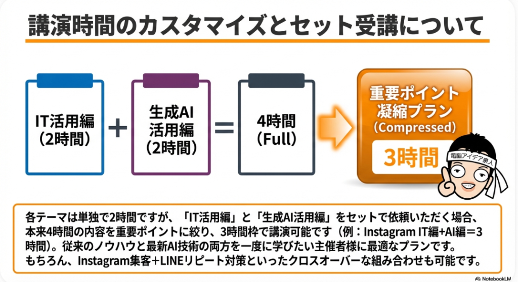 A: 基本的に1コマが2時間の構成になっています。同じプラットフォームのIT活用編と生成AI活用編を組み合わせる場合は、本来4時間必要ですが、3時間の枠で受講することができます。また、以前はInstagramとLINE、GoogleマップとLINEなど、異なるプラットフォームを組み合わせたセミナーも実施していました。例えば「Instagramで集客してLINE公式でリピートする方法」のように、2つのカテゴリーをまたぐ場合は3時間必要です。教えるべき内容が年々増えているため、2時間では厳しくなってきており、申し訳ないですが複数カテゴリーをまたぐ場合は3時間と考えてください。