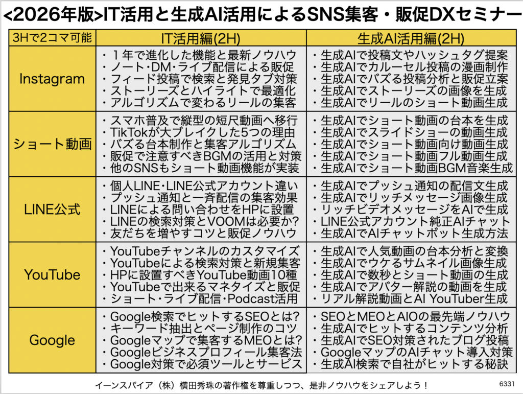 | 生成AI活用編 | ・投稿文・ハッシュタグ提案: AIによる最適テキストの自動生成<br>・AI漫画制作: カルーセル投稿用漫画のプロンプトエンジニアリング<br>・企画立案: バズる投稿の徹底分析とAIによる販促シナリオ策定<br>・ビジュアル生成: AIによる画像およびリール用ショート動画の量産 |