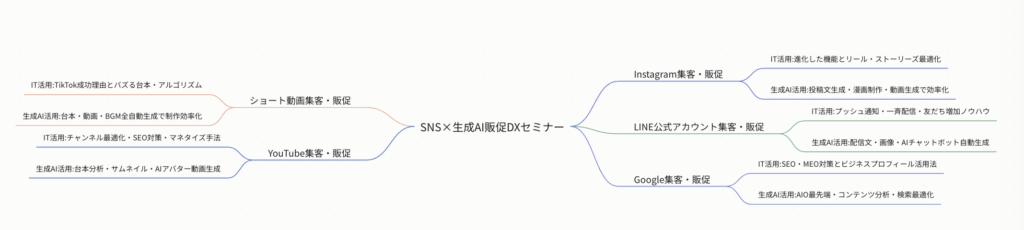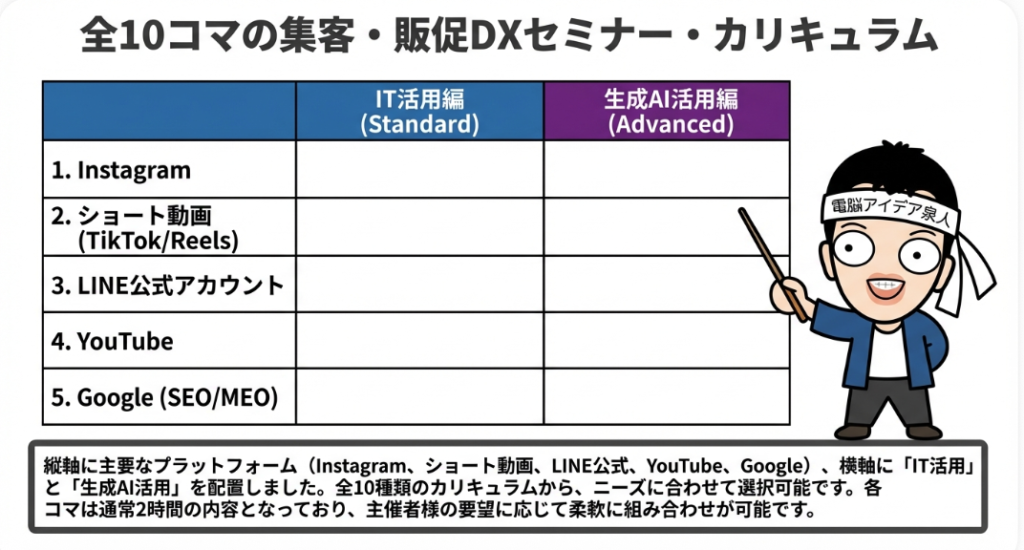 💼 DXセミナー デジタルトランスフォーメーション(DX)を推進するための教育プログラム。IT活用編と生成AI活用編の2本立てで構成され、各テーマ2時間で実施。Instagram、ショート動画、LINE、YouTube、Googleの5カテゴリーで全20コマのカリキュラムを用意。企業や個人がデジタル技術を活用して集客・販促を革新するための実践的ノウハウを提供する。