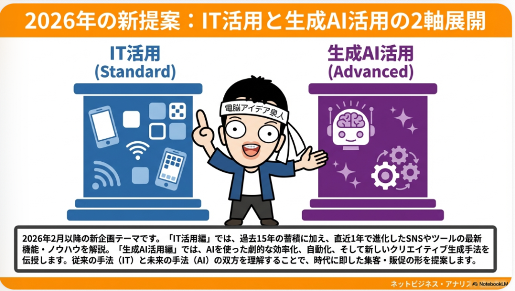 ネットビジネス研究会が2026年2月以降に実施する新企画セミナーの紹介。Instagram、ショート動画、LINE公式アカウント、YouTube、Googleの5つのカテゴリーについて、「IT活用編」と「生成AI活用編」の2軸で構成。各テーマ2時間、2テーマ組み合わせで3時間の講演も可能。全20コマのカリキュラムで、SNSと生成AIを組み合わせた最新の集客・販促ノウハウを提供。2月24日にZOOMでセミナー会員・コンサル会員向けに第220回を開催予定。