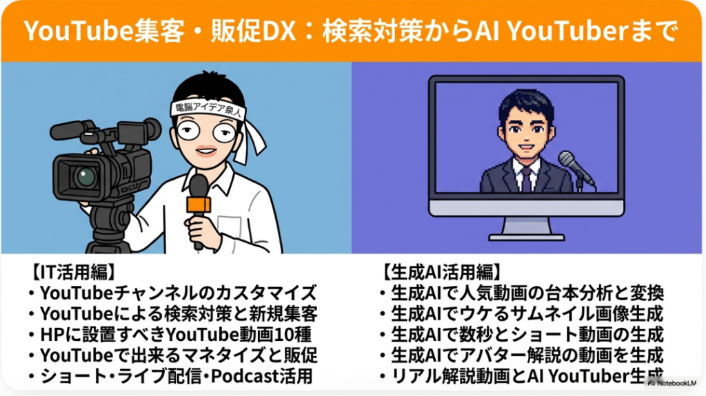 | IT活用編 | ・信頼のシステム化: HPに必ず設置すべき「10種の動画」フレームワーク<br>・チャンネル最適化: 検索対策としてのYouTubeSEOとカスタマイズ<br>・多角的運用: ショート、ライブ配信、ポッドキャストのマネタイズ活用 |