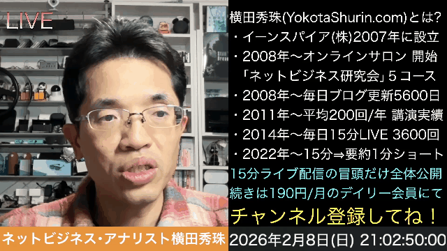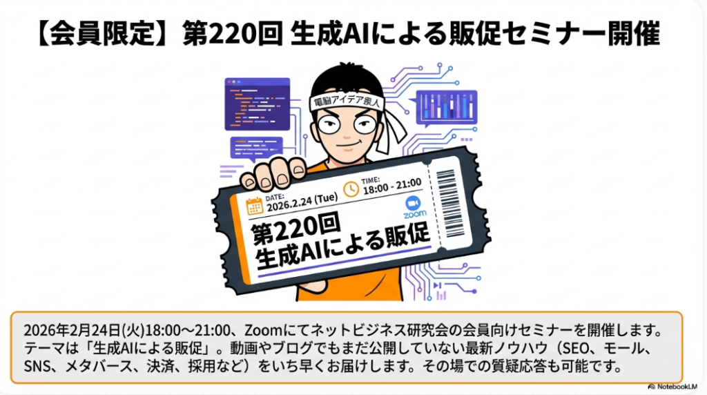 📚 ネットビジネス研究会 ネットビジネスに関する最新ノウハウを提供する研究会組織。セミナー会員とコンサル会員向けに定期的にZOOMセミナーを開催し、ブログや動画では未公開の情報をいち早く提供。質疑応答やコンサルティングも実施し、参加者のビジネス支援を行う。2026年2月で第220回目を迎える歴史ある活動を展開している。