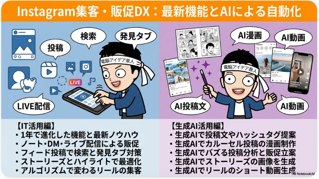 | IT活用編 | ・最新機能と15年の蓄積: 2026年時点の最新トレンドと運用定石<br>・ファン化の深度: ノート、DM、ライブ配信を駆使した販促術<br>・プロフィール最適化: ストーリーズとハイライトの戦略的活用<br>・アルゴリズム攻略: 最新リールアルゴリズムの徹底理解 |