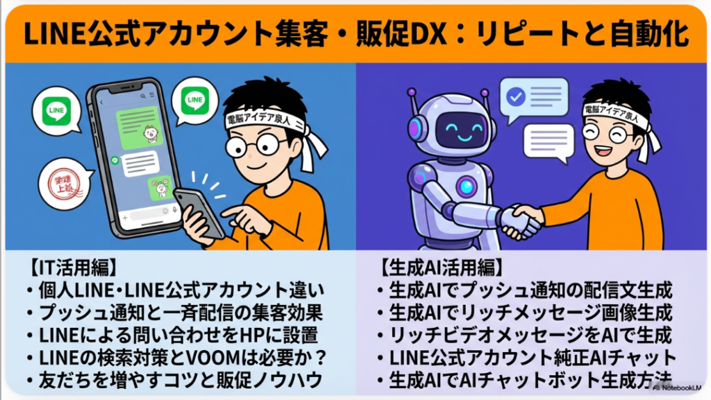 | IT活用編 | ・公式アカウントの優位性: 個人LINEとの違いとビジネス利用の本質<br>・開封率の最大化: プッシュ通知と一斉配信による即時的な集客術<br>・友だち獲得ノウハウ: HP連携、LINE検索(VOOM)対策の具体策 |