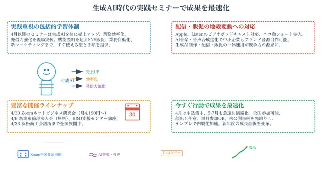 今回の記事では、2026年4月以降に予定されているセミナーや講演の新企画テーマについて、詳しくご紹介しました。まず、4月30日に開催される第222回ネットビジネス研究会では「生成AIによる販促」をテーマに、最新のノウハウが共有される予定です。また、オンラインサロンのセミナー会員やコンサル会員といったお得な会員制度についても改めてお伝えしました。生成AIの活用は、SNS販促や業務改善だけでなく、AI音楽やビデオポッドキャストといった新しい領域にまで広がりを見せています。さらに、倫理法人会での「生成AIで激変する人類の役割」や、R&D支援センターでの「業務効率化・自動化のポイント」など、外部セミナーへの登壇情報もお届けしました。4月以降のスケジュールは例年以上のペースで埋まってきており、講演依頼は早めの連絡が推奨されます。生成AIと共にビジネスも働き方も大きく変わるこの時代、セミナーや講演を通じて一緒に学び、成長していきましょう。