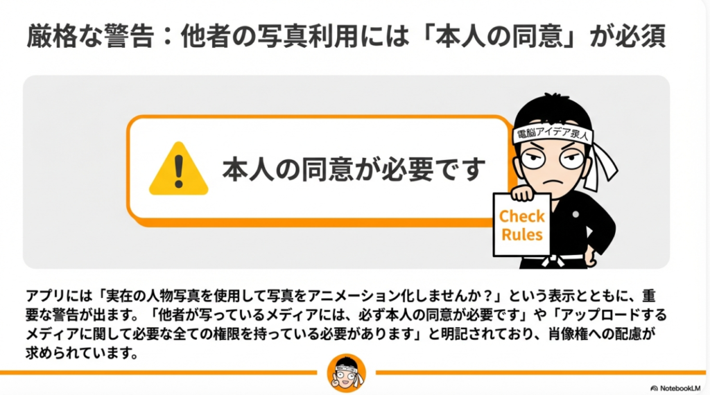 動画生成AIを利用する際、組織が最優先すべき戦略的課題は「権利の所在」の完全な透明化です。Soraのベータ版アプリにおいて、写真をアップロードする際に提示される警告事項は、今後のデジタルコンテンツ制作における「ゴールデン・ルール」と定義すべきです。