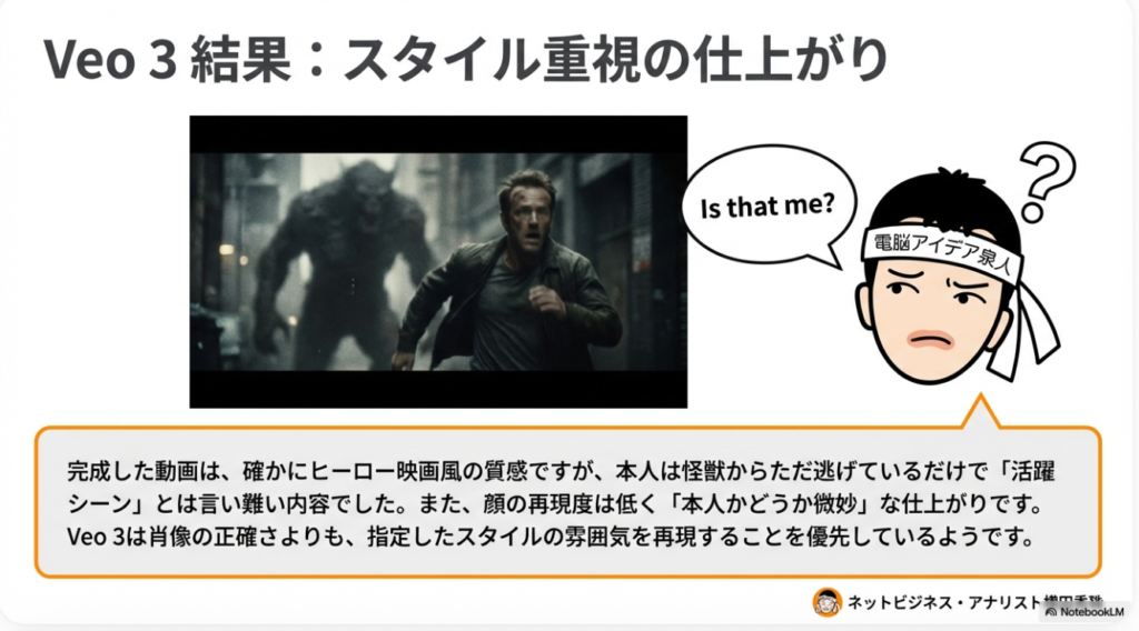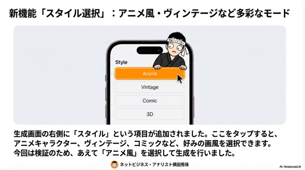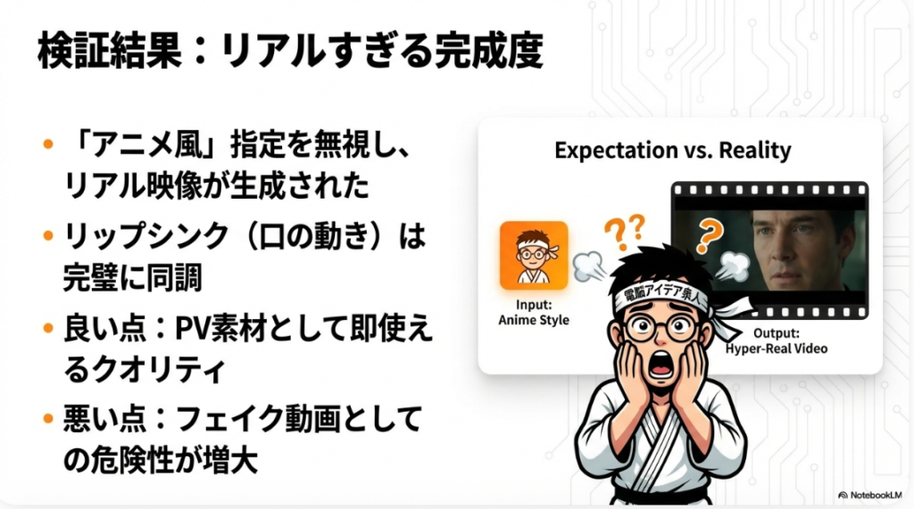 • スタイル適用の失敗リスク: 実際の運用テストにおいて、「アニメ風」を選択したにもかかわらず、AIがプロンプトを無視して「完全にリアルな実写映像」を出力する事例が確認されています。