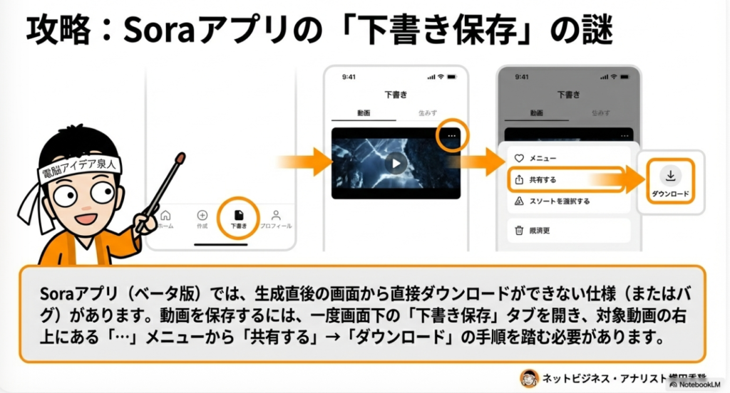 • デバイス特性によるワークフローの分離: Soraモバイルアプリ版における「下書き保存(Drafts)」や「出演作品(Appearances)」タブの仕様、および動画の共有・ダウンロード権限の制限(バグを含むUIの差異)を把握し、生成からアーカイブまでのフローを標準化してください。